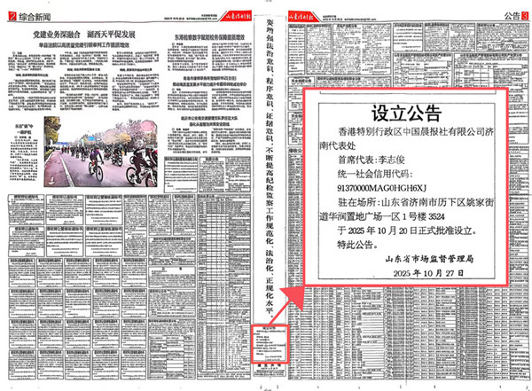 日前,中国晨报社有限公司济南代表处完成法定登记流程,在山东正式落地运营。该代表处选址济南,将以山东为重要支点面向全国开展工作,为香港、澳门与内地的信息互通、文